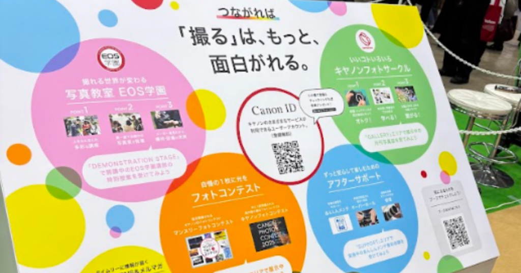 キヤノンのニュースリリースでは、初心者向けのミラーレスカメラを使った撮影体験コーナーが用意されていると明記されており、スマホからステップアップしたいユーザーでも気軽に一眼画質を体験できる構成になっていました。